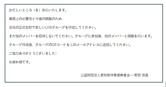 当基金の代表者を騙る、LINEグループの作成を求める不審なメール(なりすましメール)が確認されました。